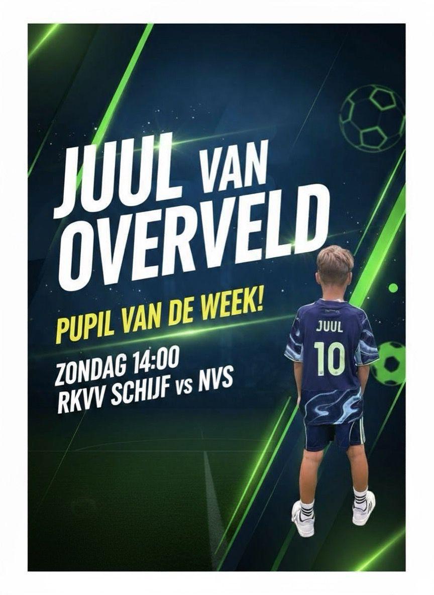 Zondag 12 oktober is Juul van Overveld Pupil van de week aanvang wedstrijd 14uur RKVV Schijf vs NVS
